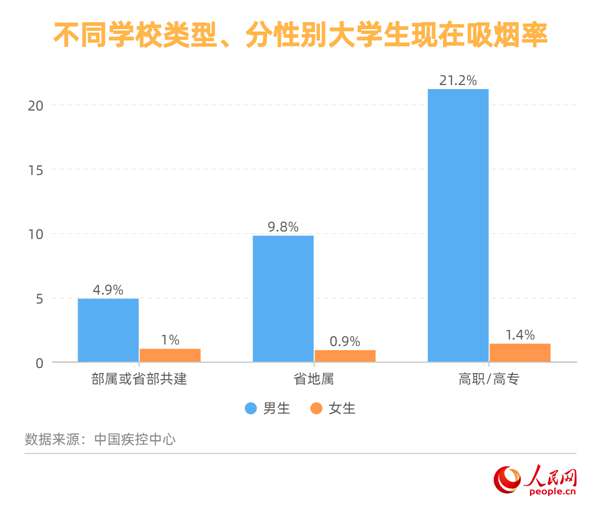 调查结果显示,我国大学生现在吸烟率为7.8%,男生(15.0%)高于女生(1.1%);听说过电子烟的比例为90.3%、使用过电子烟的比例为10.1%、现在使用电子烟的比例为2.5%。